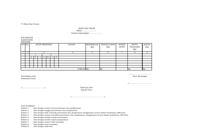 Bagaimana cara penulisan buku kas? Apakah buku kas adalah data penting untuk kepentingan bisnis? Format bku ini sudah disesuaikan dengan permendagri 113 kalau tidak salah :v. Format buku kas umum desa. Uraian transaksi penerimaan kas atau pengeluaran kas.