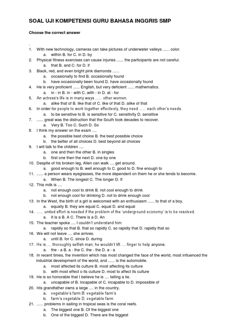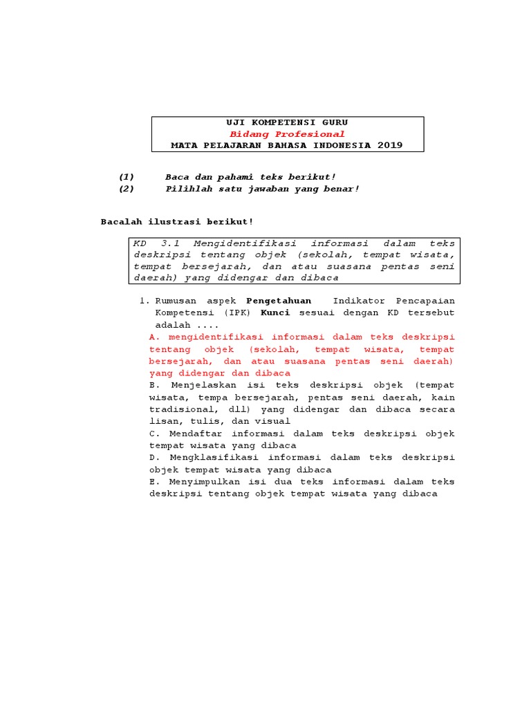 Kisi Kisi Soal Uji Kompetensi Guru Ukg Mata Kisi Kisi Soal Uji Kompetensi Guru Ukg Mata Pelajaran Bahasa Indonesia Jenjang Pendidikan Smp Kompetensi Utama Standar Kompetensi Pdf Document from demo.fdokumen.com Documents similar to latihan soal uji kompetensi guru (ukg) slb.pdf. Scl adalah salah satu inovasi di bidang pendidikan yang bercirikan: Trafik pencarian google berkaitan dengan : Semakin dekatnya waktu pelaksanaan ukg 2015 tentunya harus semakin banyak pemadatan materi dalam menghadapi uji kompetensi guru. Syafi'i kecamatan pabelan kabupaten semarang. Analisis soal secara kualitatif sangat baik karena setiap soal dilihat oleh. Soal uji kompetensi ukg pedagogik guru sd. Pada pendidikan profesi guru (ppg) program keahlian kuliner.