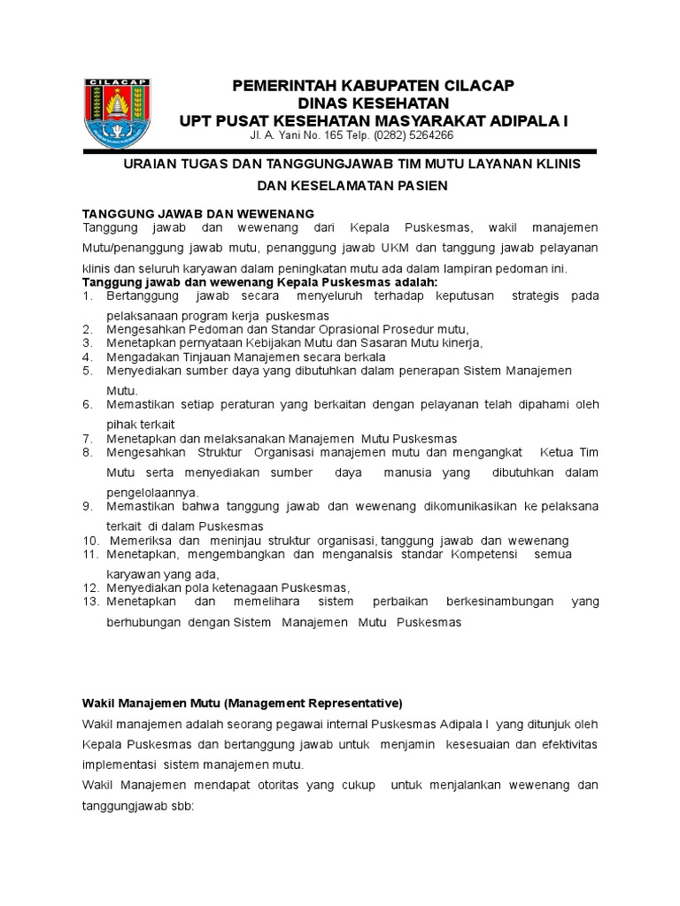 Uraian Tugas Tim Mutu Puskesmas / Doc Struktur Organisasi Peningkatan Mutu Dan Keselamatan Pasien Pmkp Sammy Fendy Academia Edu / Use the download button below or simple online reader.